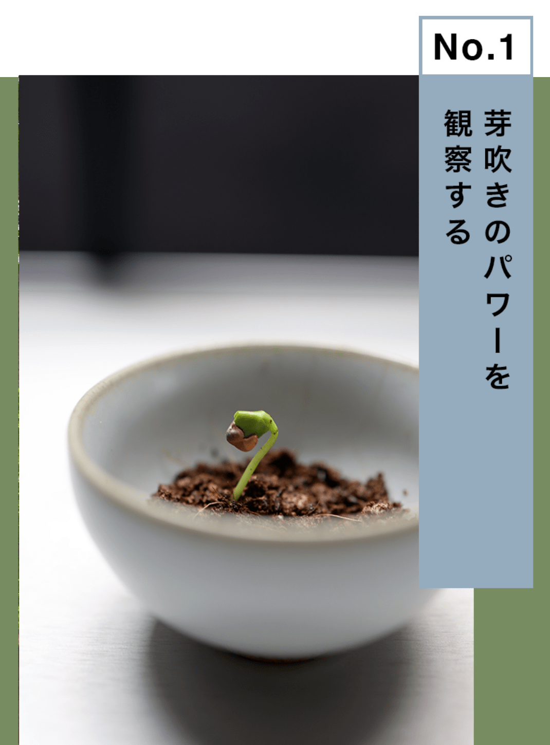 部屋の中に植物があると、パワーを感じるはず。種を土に植えて水をやり、芽が出るまでを観察してみましょう。毎日少しずつ確実に成長する様子には元気をもらえます。