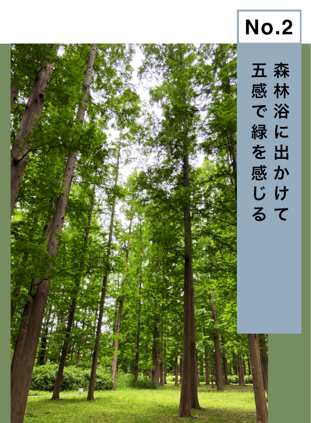 木々のざわめく音、鳥たちの鳴き声。そして目にも鮮やかな新緑の緑。五感で緑のエネルギーを感じることができるのが森林浴の醍醐味です。都内でも意外に近くに大きな公園がありますよ。