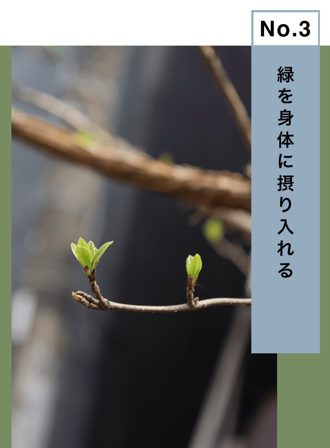 芽が出るにはまだもう少し時間がかかりそう。春、外は新しい緑であふれている。私も緑の力を取り込んで、前向きな芽吹きのパワーを手にしたい。