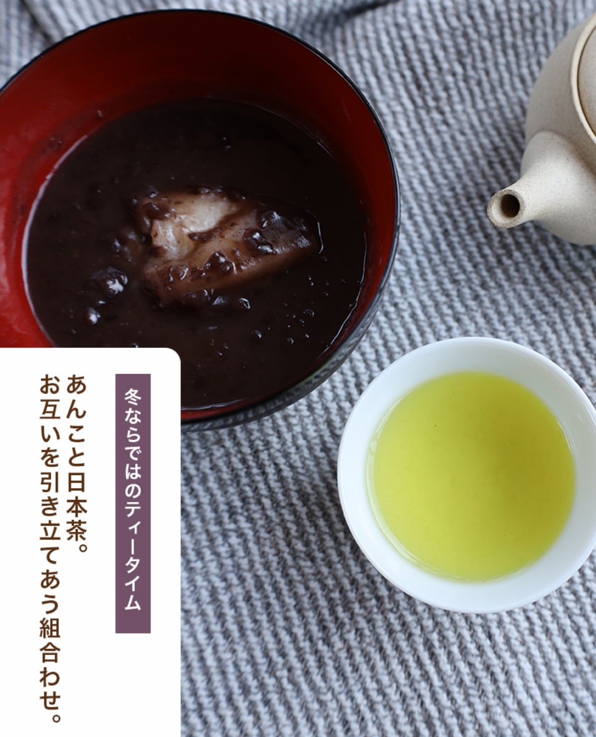 寒さで縮こまった体にあたたかく染み渡るお茶。 お茶はいつだってあなたのそばに寄り添います。 冬はあたたかいものの喜びを1年で一番感じられる季節。 冬ならではのティータイムを楽しみましょう。